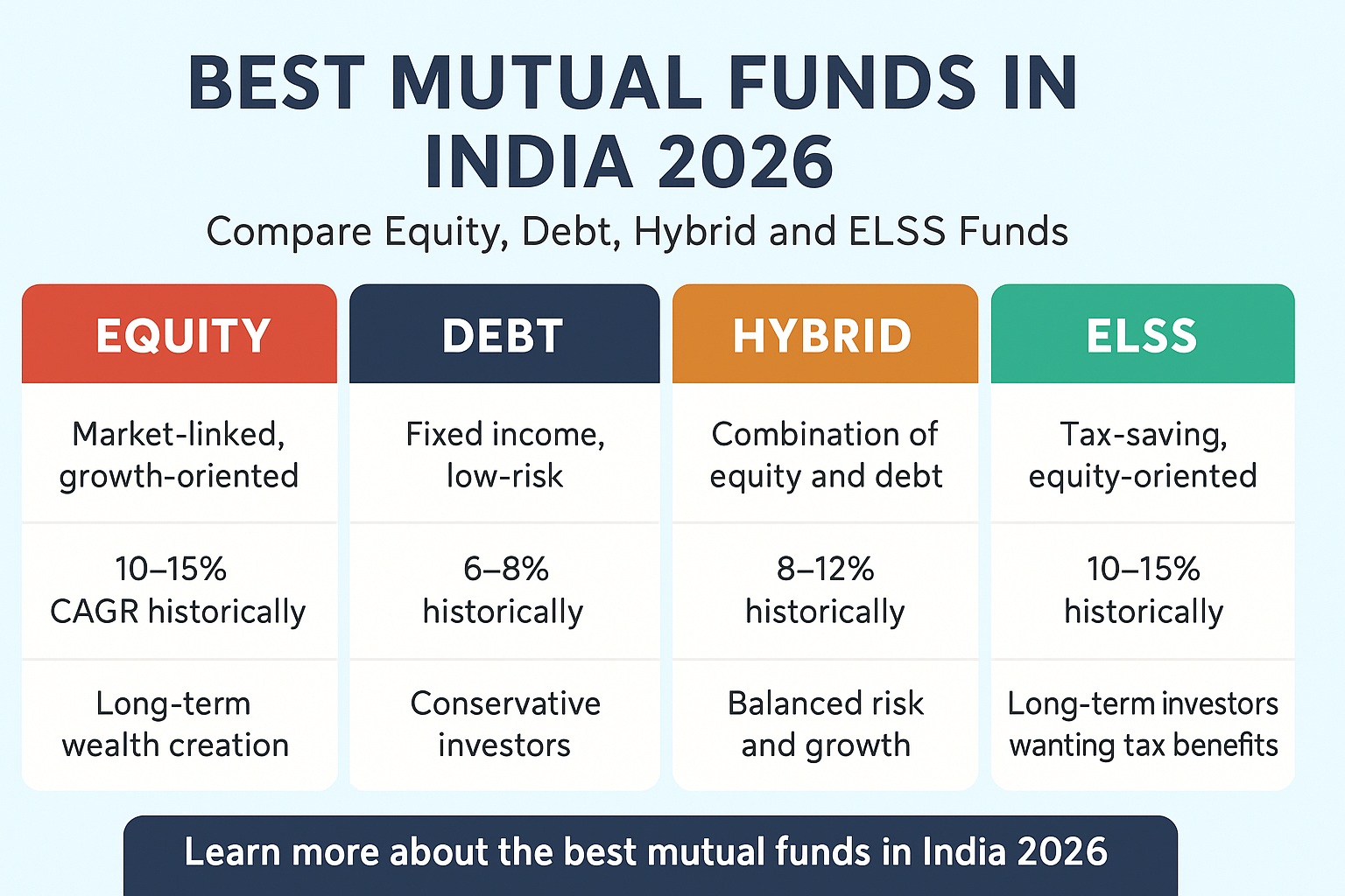 Choosing the best mutual funds in India 2026 becomes easier when you understand how each fund type works. A balanced mix of equity, debt, hybrid, and ELSS funds can support long-term and short-term financial goals.